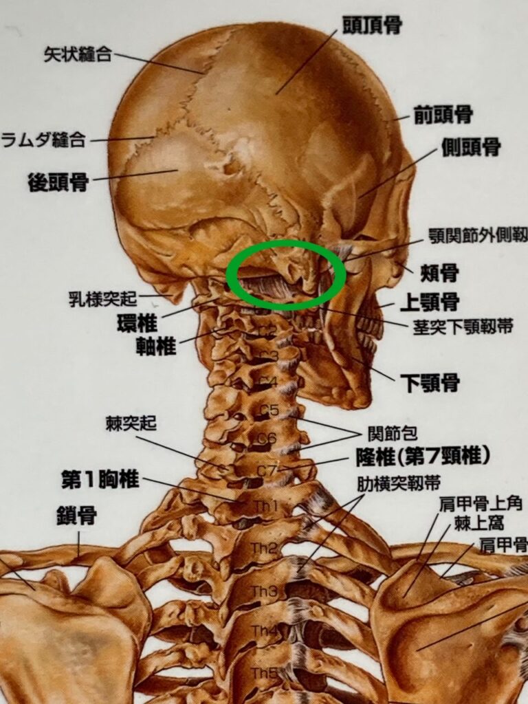 写真の緑色の◯の部分の筋肉や骨の調整をしていきます。